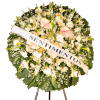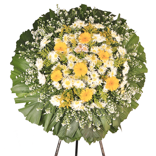 Coroa de flores da linha Premium, com Gérberas amarelas, flores campestres brancas e folhagens. Envie sua mais bela homenagem póstuma e votos de conforto e condolências. Medidas aproximadas de 1,00m por 1,00m.