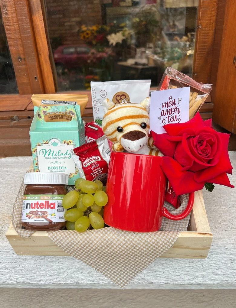 composto por Sachet Café ,irresistível Nutela, Mini Bolo, Palitinhos Salgados, Cookies, Alfajor, Cacho de uva, Caneca de cerâmica, uma linda rosa vermelha vermelha e um tigrinho de pelúcia.